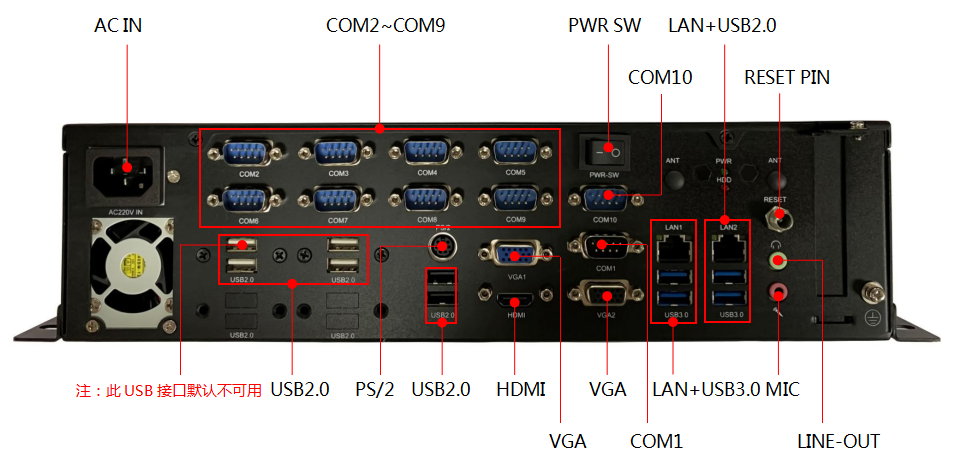 COM | 10,COM3/COM4可選RS232/RS485,其他接口為標準RS232模式,COM2/COM3/COM4第9針可選5V/12V帶電 |