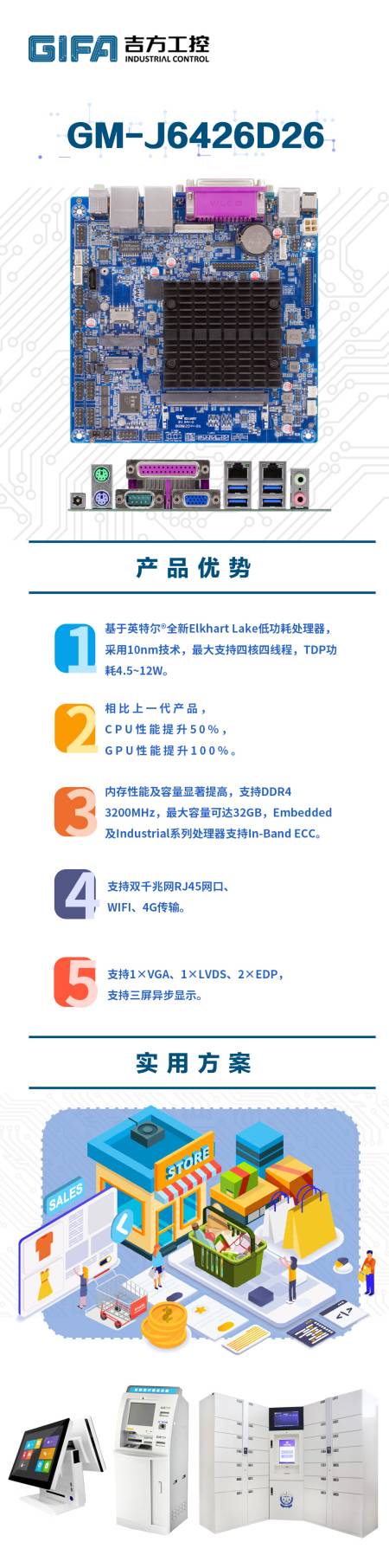 零售、自助、一體機、工業控制等行業的主板GM-J6426D26通過充沛的算力、豐富的擴展接口以及成熟有效的單主機多虛擬機技術,將電子價簽基站、安全監控、自助收款機等眾多數字化設備,以及其中的管理應用和業務數據有機融合在一起,為門店的數字化管理提供了可靠保障。